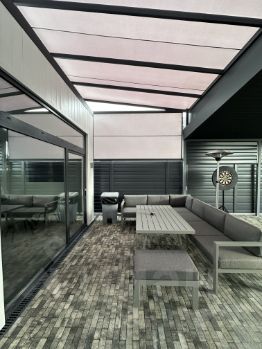 Возле летней кухни выполнен навес под зоной отдыха , под наклоном из тентов которые пропускают свет но при этом удерживают влагу. Учень уютно когда не металл над головой.