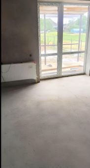 Оштукатурен , полы залиты , электрика, вода . Отопление настенным котлом ,батареи + теплый пол.