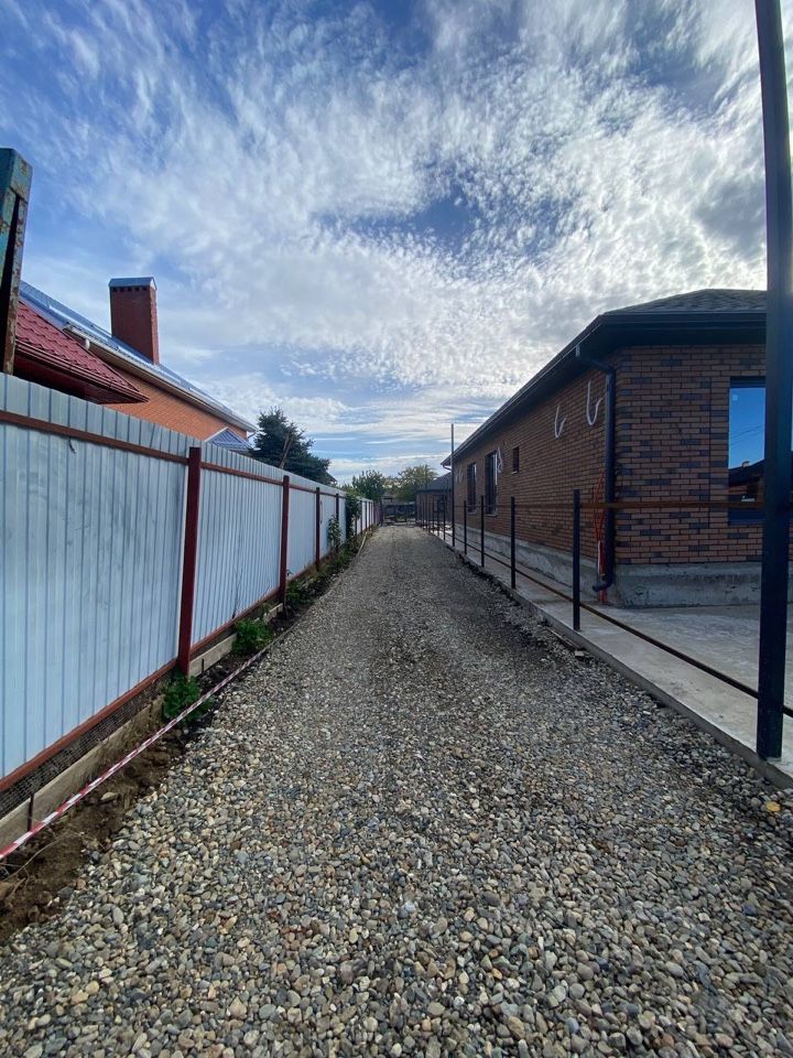 По периметру участок огорожен забором,по фасаду капитальные кирпичные откатные ворота,калитка . Двор выложен брусчаткой,завезен чернозем.