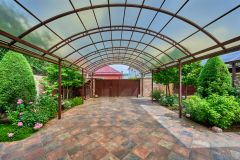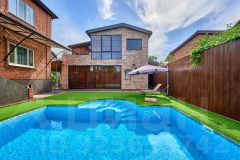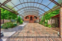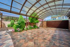 Просторный двор вмещает до 4 машин, есть навес, гостевой дом, бассейн и зона отдыха.