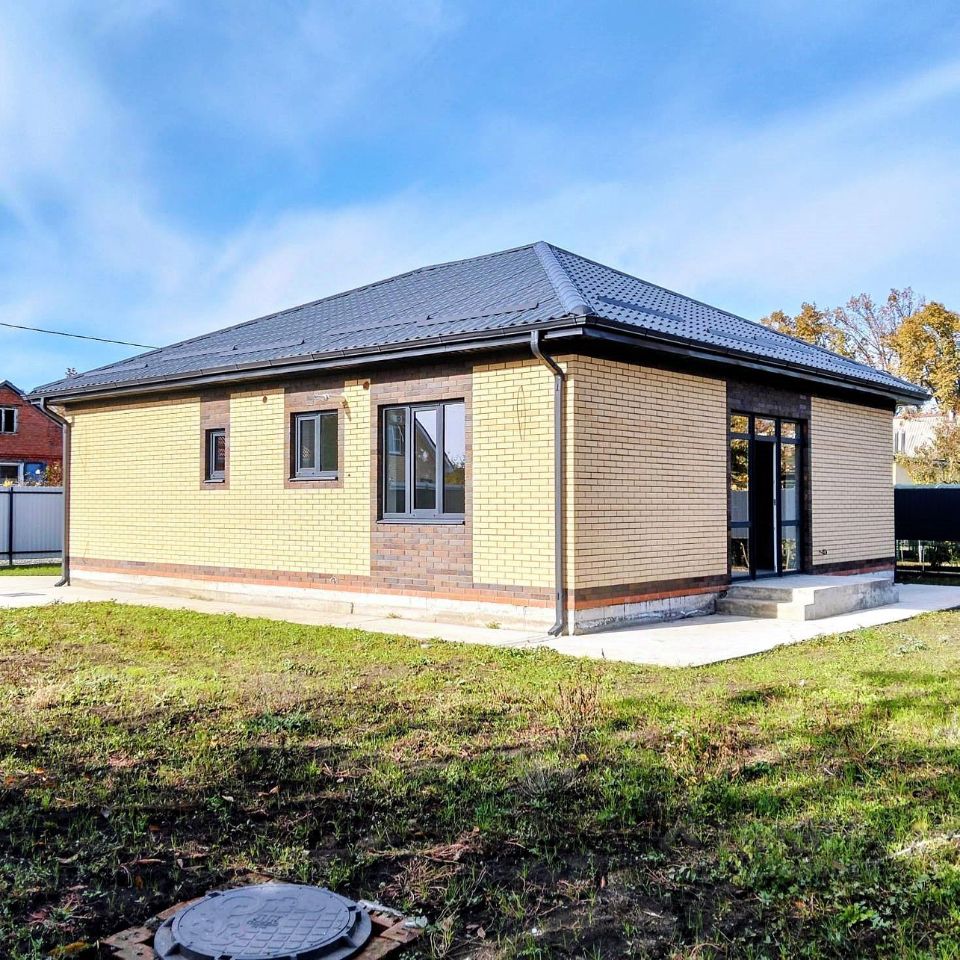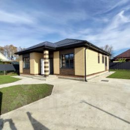 Одноэтажный коттедж возведен на свайно-ростьверковом фундаменте, материал стен — отсевной блок, наружные — облицовочный керамический кирпич, энергocбeрeгaющие oкнa с затемнением "Coлap" и внешней ламинацией, кровля — металлочерепица.