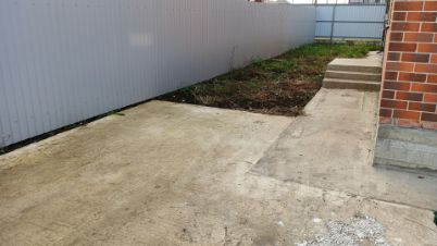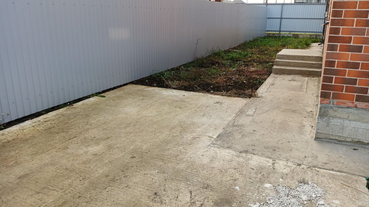 - Откатные ворота. По периметру дома сделана отмостка. Забетонировано место под заезд машины.