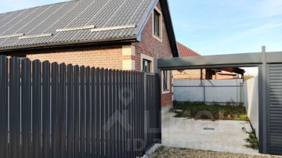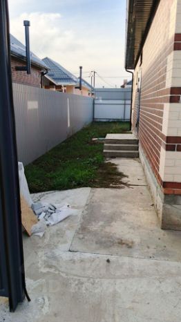 - Роллетные ворота. По периметру дома сделана отмостка. Забетонировано место под заезд машины.