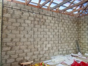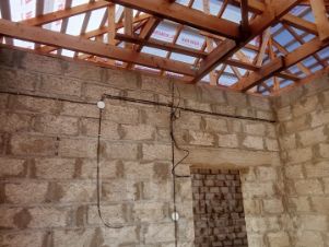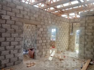 Этапы строительства можете увидеть на фото начиная с ленточного армированного 12мм фундамента с углублением 80 см и цоколем 40 см, заканчивая крышей из металлопрофиля с утеплителем. Стены блочные утеплены пенопластом 5 мм, снаружи декоративная штукатурка. В доме везде теплые полы и радиаторы отопления.