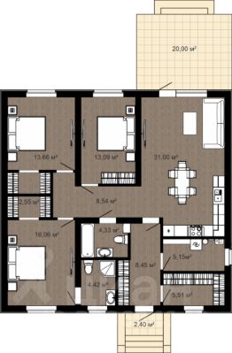 Рациональная схема с минимумом коридоров включают гардероб и просторную мастер-спальню