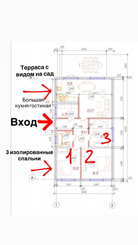 — Планировка: три изолированные спальни, просторная кухня-гостиная с выходом на террасу, санузел и прихожая.