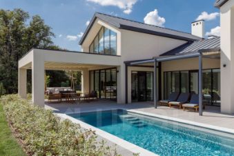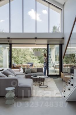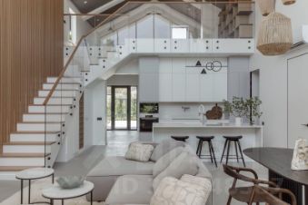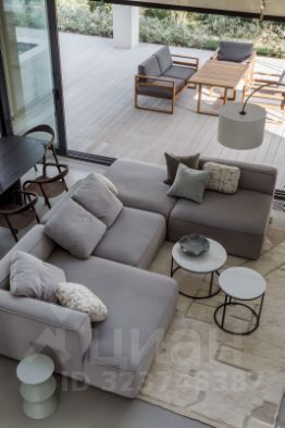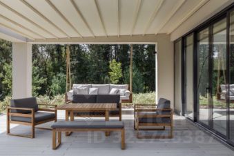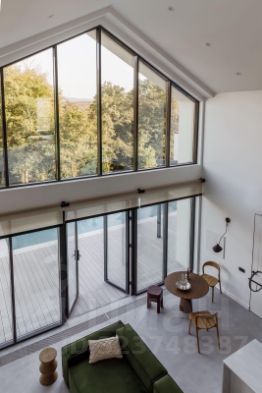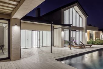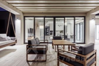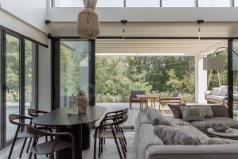 Над террасой установлены складывающиеся козырьки, а в большой гостиной вся стена стеклянная и может открываться.