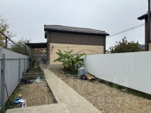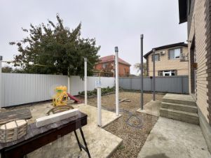 Хорошо спланированный участок, место для авто, дорожки, клумбы из бордюра, отмостка. Подготовленные места для заливки. Навес впереди дома.