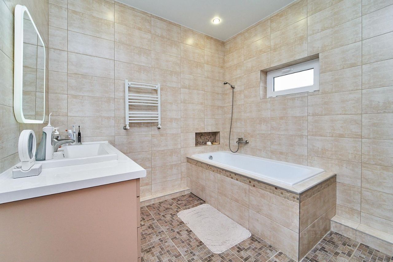 Внутри дома вы найдете спальню с гардеробной, просторную кухню-гостиную, кабинет и ванную комнату с ванной и душем. Все помещения отделаны керамической плиткой, а полы оборудованы системой теплого пола. Дом отапливается газом, есть артезианская скважина и два септика (для дома и бани).