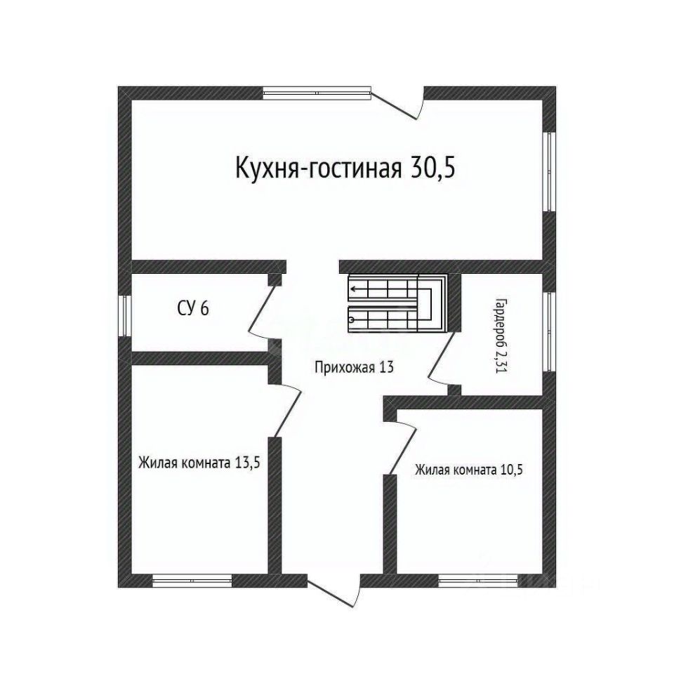 Общая площадь: просторный дом с частичным современным ремонтом. Этажность: двухэтажный, второй этаж — мансардный. Первый этаж: Кухня-гостиная — 30,5 м², выход на террасу. Две спальни — 13,5 м² и 10,5 м². Санузел — 6 м², гардеробная комната. Отопление: газ заведён, дом теплый и светлый. Водоснабжение: скважина