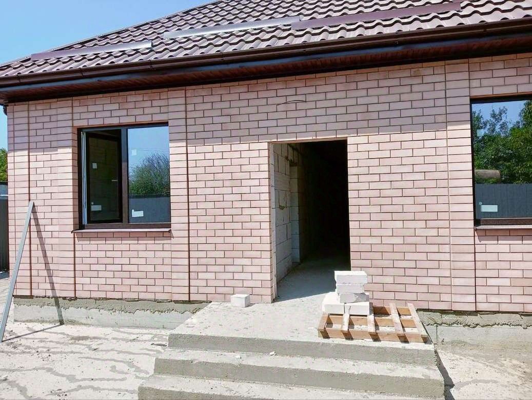 Дом построен из газоблока 30 см, облицован кирпичом, с соблюдением всех технологий строительства: между газоблоком и кирпичом вентиляционный канал, фундамент ленточный 80 см, укреплен армопоясом, единый монолит с террасой. Из кухни гостинной выход на террасу 15 кв.м, достаточно большое пространство для отдыха.