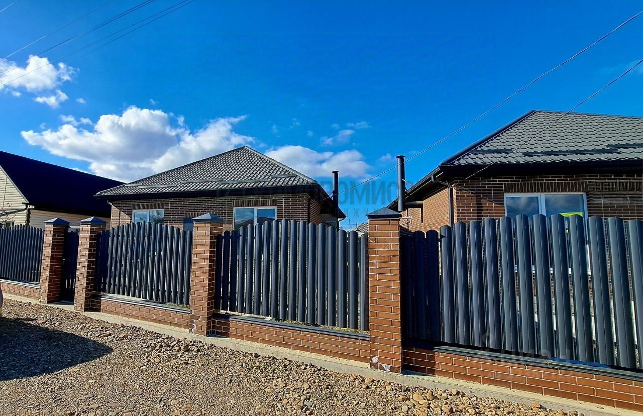 огорожен по периметру забором из металлического профиля, с фасада из евроштакетника на кирпичных столбах;