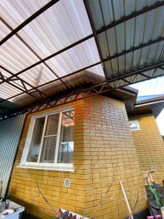 Забор по периметру территории, высокий навес, просторный въезд для 2х машин.