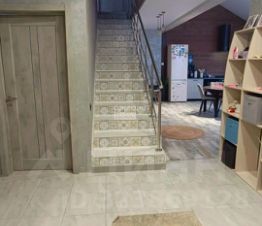 Полы на первом этаже (кроме спален) выполнены из керамогранита, а в спальнях — из кварцвинила. Стены отделаны декоративной штукатуркой, натяжные потолки установлены во всем доме.