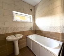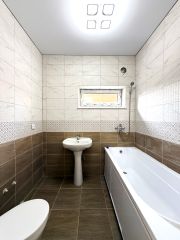 Внутри дома выполнен ремонт: натяжной потолок во всем доме, в прихожей — плитка, ванная комната отделана плиткой, установлена сантехника, стены под покраску/обои, установлены межкомнатные двери.