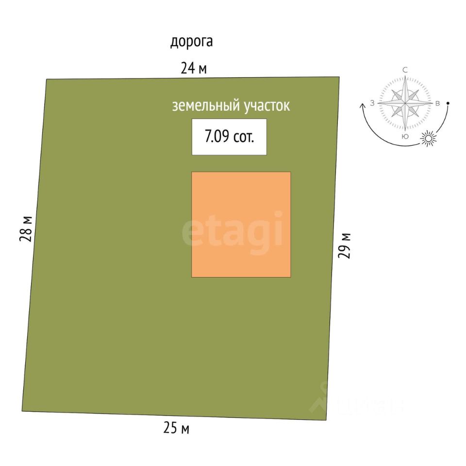 Участок правильной формы с просторной территорией перед домом и за ним, что идеально подходит для создания зоны отдыха или сада. На участке установлены столбы под забор.