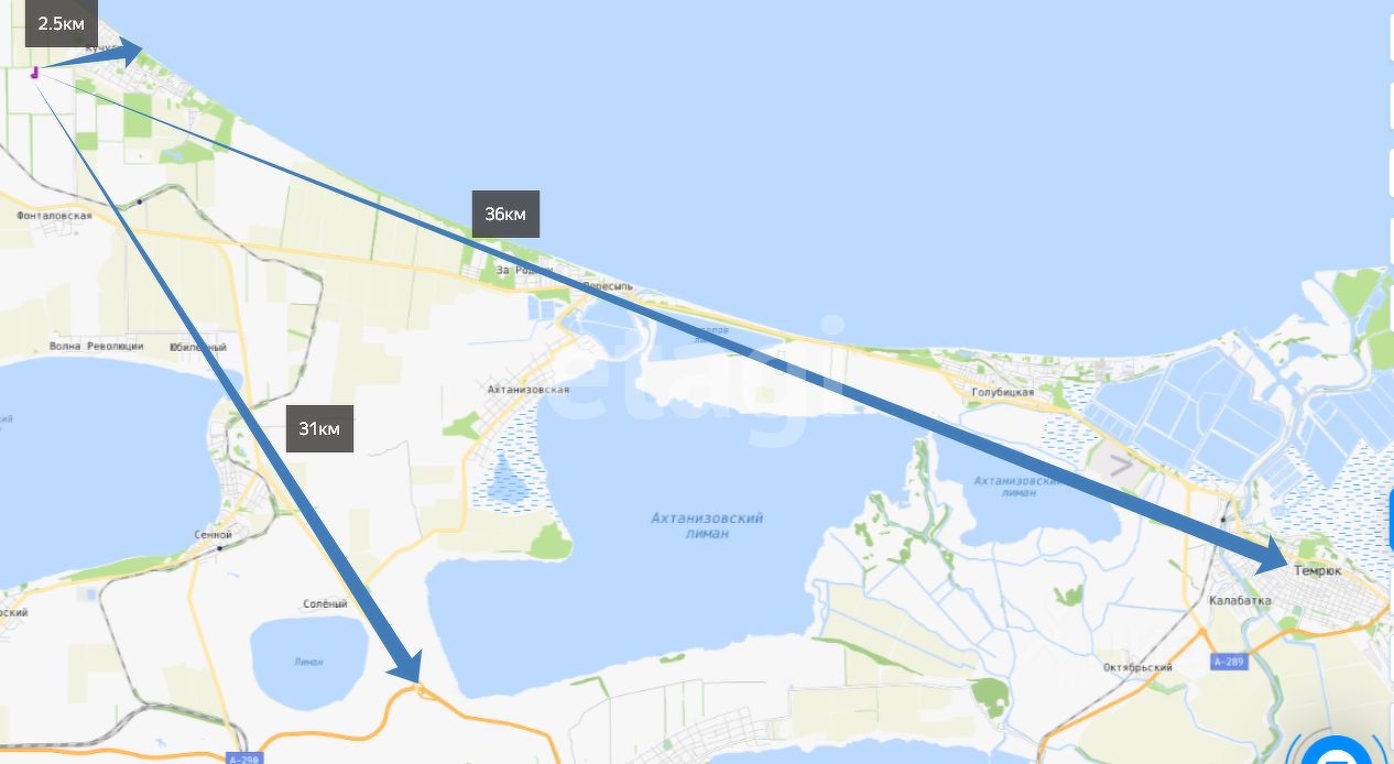 Участок находится в 36 км от Темрюка и в 70 км от Анапы, что обеспечивает доступ к развитой инфраструктуре крупных населенных пунктов при сохранении преимуществ тихого coastal-поселения. Данный объект представляет собой стратегический актив для создания родового поместья, агробизнеса или будущего жилого комплекса с учетом долгосрочной перспективы развития территории.