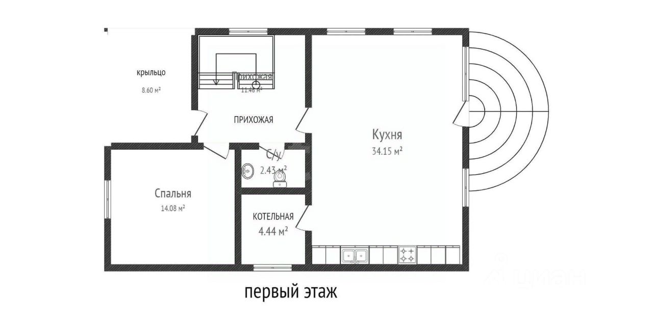 - 1-й этаж кухня-гостинная 30 кв.м.+комната, санузел, прихожая, 2-й этаж три комнаты и санузел