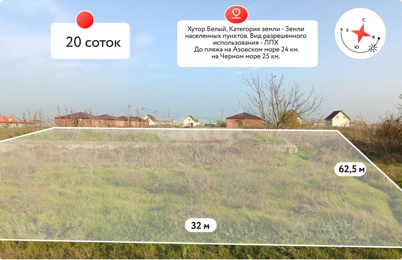 Участок площадью 20 соток в хуторе Белый предлагает выгодную инвестицию и возможность построить дом в активно развивающейся локации Краснодарского края. Земля относится к категории земель населенных пунктов с разрешенным использованием для ведения личного подсобного хозяйства.
