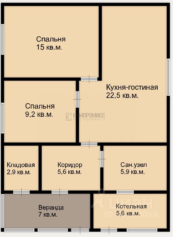 В доме 2 спальни, кухня-гостиная, прихожая, сан.узел, котельная.