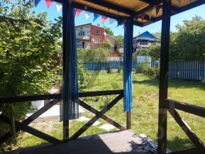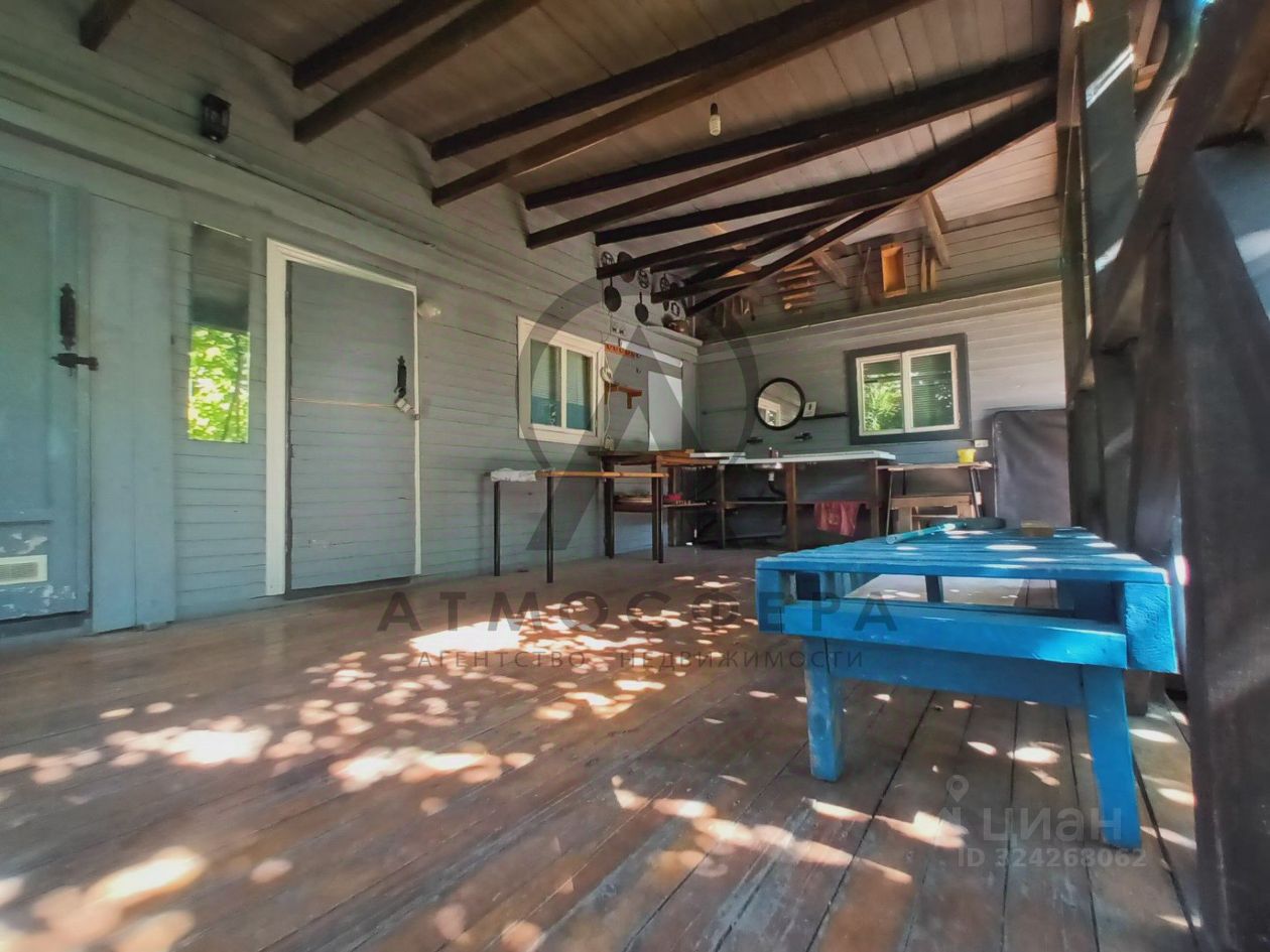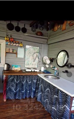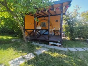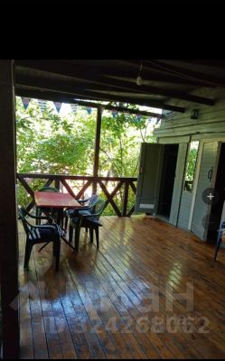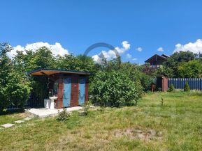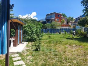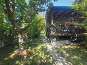 Стоит новый деревянный дом с террасой, подходящий для временного/сезонного проживания, также установлена беседка, оборудованная под летнюю кухню, есть летний душ и туалет.