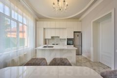 На первом этаже находится кухня 21 м2 с качественным гарнитуром, встроенной техникой именитых брендов и рабочая зона - остров. Кухня выполнена в светлых тонах.