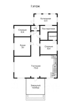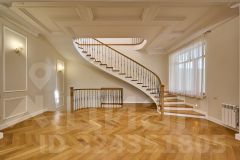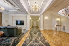 Попадая в большой, просторный тамбур с нишей для гардеробной мы перемещаемся в гостиную первого этажа 73 м2 с высотой потолков 3,3 м. Напольное покрытие выполнено из паркетной доски и керамогранита.