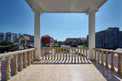 Поднимаясь по лестнице из массива и кованых перил попадаем на пространство второго этажа с высотой потолков 3,6 м. Нас встречает большой открытый балкон где так приятно проводить время в неспешных беседах с родственниками и друзьями.
