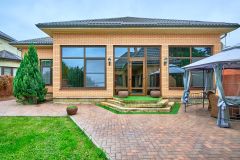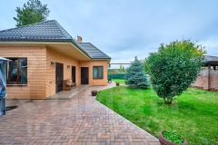 Монолитный каркас с ленточным фундаментом — гарантия надежности, плита перекрытия 20 см, что позволяет, при желании, сделать второй этаж. Крыша — финская металлочерепица.