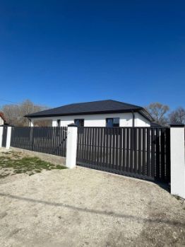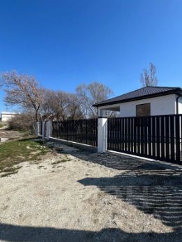 Ровный,правильной формы. Огорожен забором по периметру.Установлены откатные ворота и калитка.