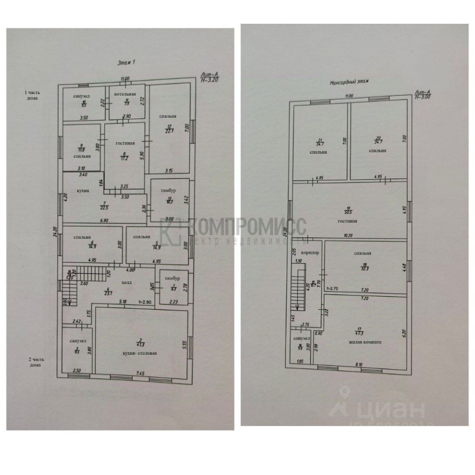 Первая часть дома: кухня, две спальни, гостиная, котельная, санузел. Вторая часть дома: на первом этаже- 2 спальни, кухня-гостиная, санузел, холл и полностью весь второй этаж (4 спальни, санузел, гостиная). Есть возможность переиграть и определить часть второго этажа на первую часть дома.