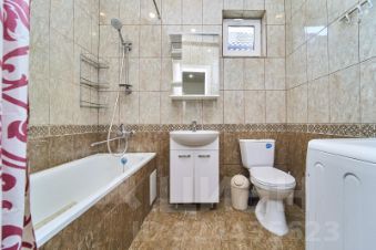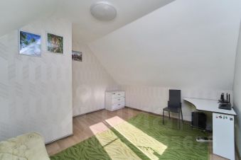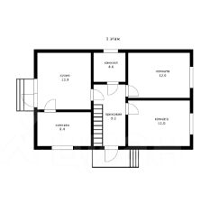 На планировке первого этажа видно, что из гостиной можно пройти в небольшую гостевую комнату площадью 8.4 м2. Кроме того на первом этаже есть две спальные комнаты площадью 12 м2 каждая с окнами на северо-запад, солнце не будет беспокоить вас по утрам. Санузел совмещённый площадью 4.6 м2, полностью в плитке, есть окно.