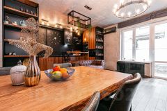 Сердце первого этажа - это конечно же просторная кухня с выходом на зону барбекю. На стене над кухонной зоной стена выполнена, как школьная доска для рисования, на ней можно рисовать меню или писать приятности близким. На кухне вся встроенная техника Hotpoint-Ariston.