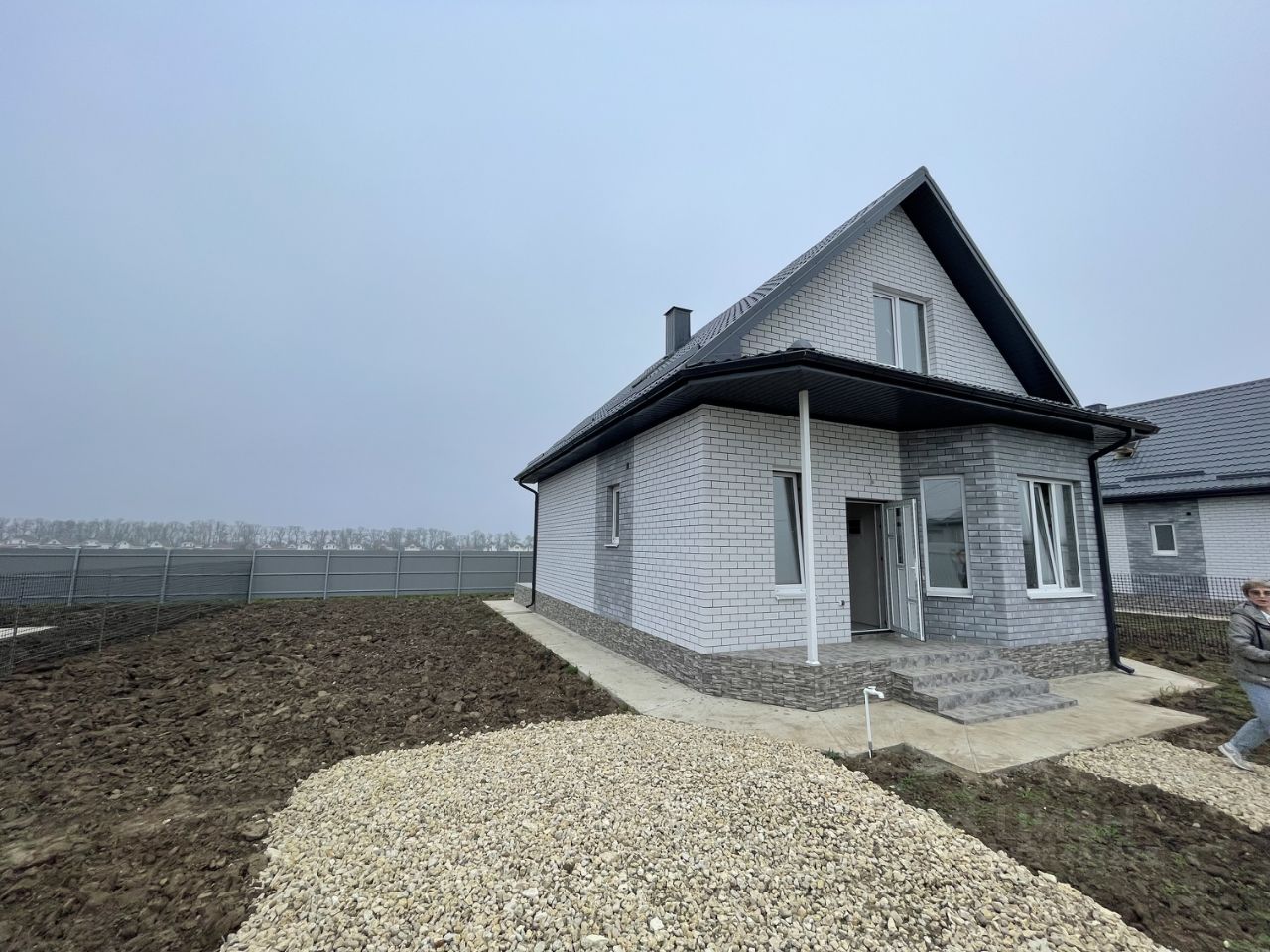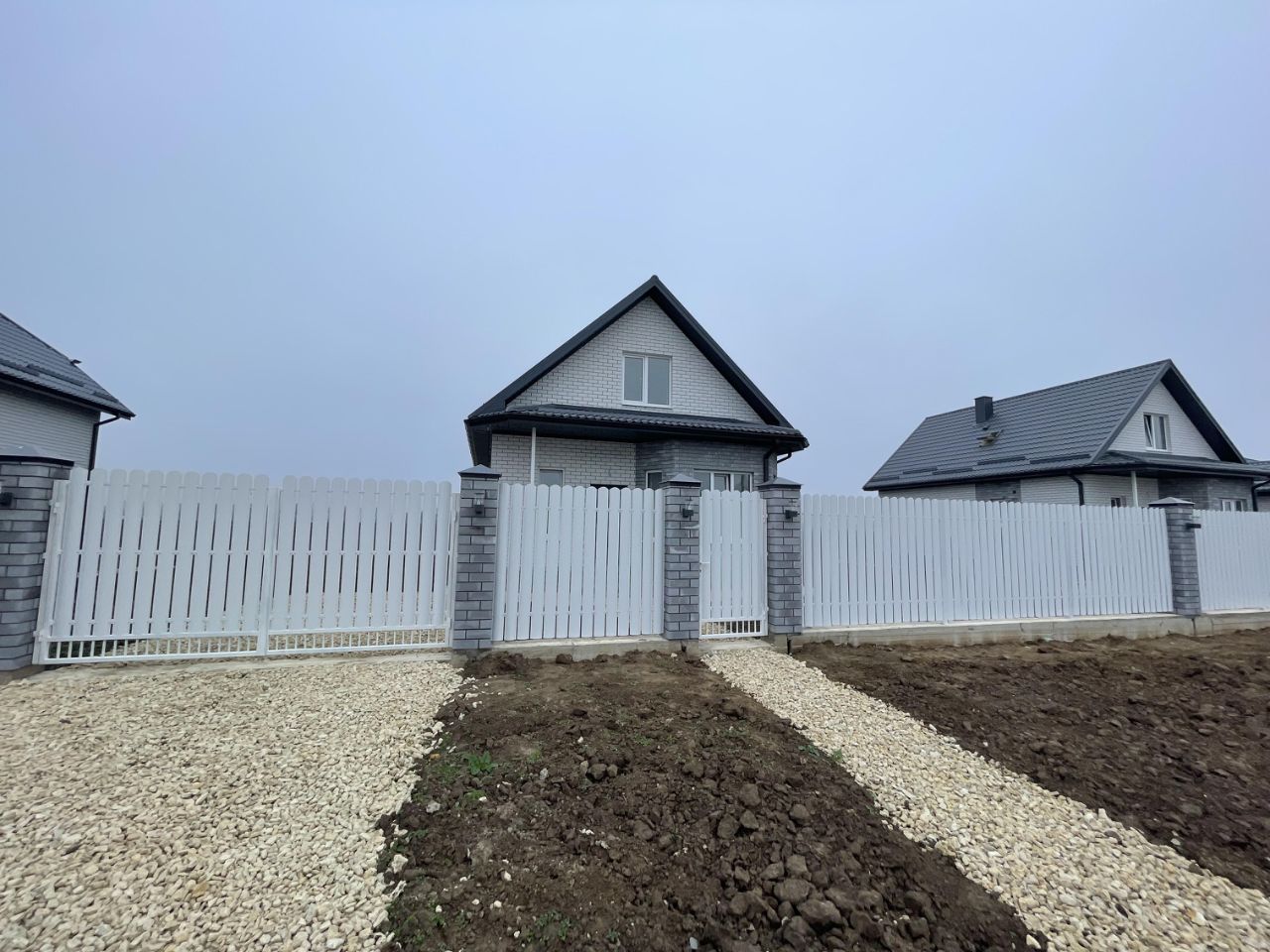 Современный дизайн: Дома выполнены из белого кирпича с серыми вставками, создавая стильный и уютный облик.