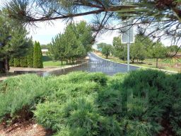 Дороги заасфальтированы, есть тротуары, вдоль проезжей части высажены хвойные деревья,
