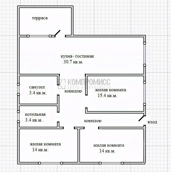 В доме три изолированные комнаты, просторный санузел, котельная, холл-коридор (с возможностью возведения лестницы на мансардный этаж) и кухня-гостиная, площадью 30,7 кв.м. с выходом на отапливаемую террасу.