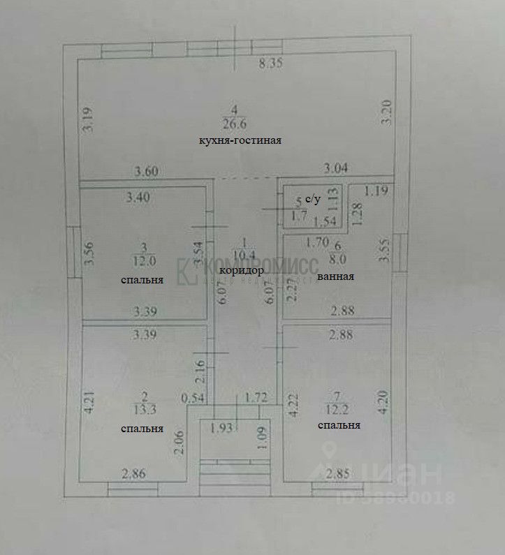 Общая площадь дома - 85 кв.м., в доме 3 изолированные жилые комнаты, площадью - 12.3, 13.2, 12 кв.м., просторный коридор, кухня-гостиная - 26.6 кв.м., ванная комната 8 кв.м. и санузел.