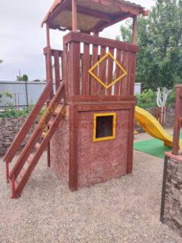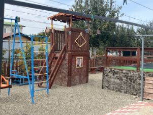 Внутри дома на первом этаже расположены кухня-гостиная, две просторные спальни, раздельный санузел и номер люкс с отдельным входом, кухней и двумя комнатами.