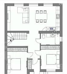 Планировка: Дом построен из кирпича. На первом этаже 2 спальни, кухня-гостиная 38 м2 с выходом на террасу 15 м2 и раздельный санузел. На втором располагаются 2 спальни и совмещенный санузел. Высота потолков в доме 3 метра. Также имеется навес для парковки двух автомобилей.