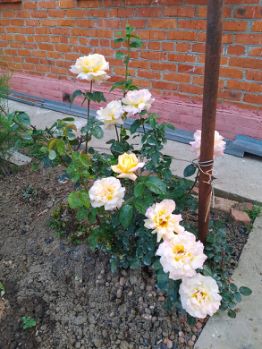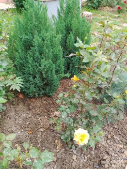 Декоративные растения: два можжевельника, ёлка, розы.