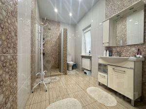 На первом этаже просторная прихожая, кухня - гостнинная больше 50м2, несколько санузлов и одна комната. Из кухни есть два выхода: в гостиную и отапливаемую веранду. Все коммуникации и котел спрятаны в подсобном помещении.