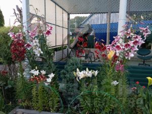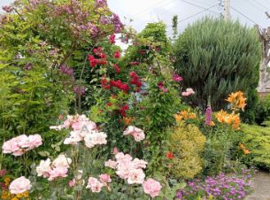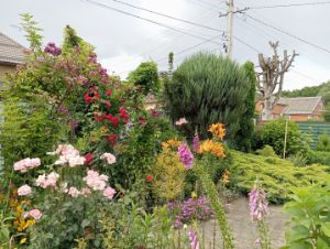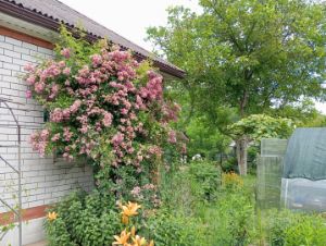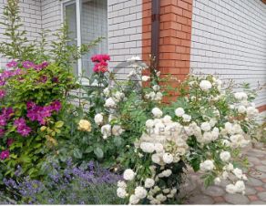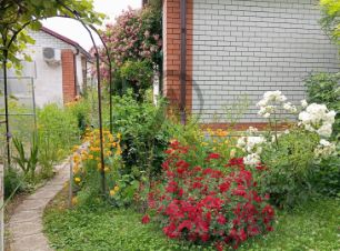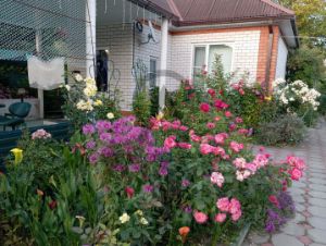 Во дворе есть кирпичный гараж под одной крышей с летней кухней, которую можно использовать как гостевой дом. Двор покрыт плиткой. Очень много декоративных растений. Начиная с весны до поздней осени двор утопает в цветах. На приусадебном участке установлена теплица, сделаны аккуратные грядки, растут различные плодовые деревья и ягодные кустарники. Есть мангальная зона для отдыха.