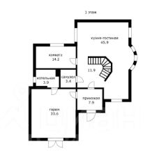 В доме продуманная планировка: на первом этаже большая кухня-гостиная (46 м²), холл, гостевая, санузел и гараж.