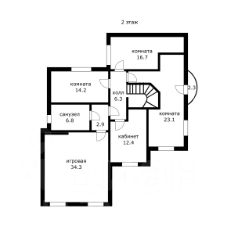 На втором пять комнат: просторная детская, кабинет и три спальни, одна из которых с балконом. Плюс большой санузел. Если нужно, можно сделать ещё и мансарду, проём под лестницу уже предусмотрен.