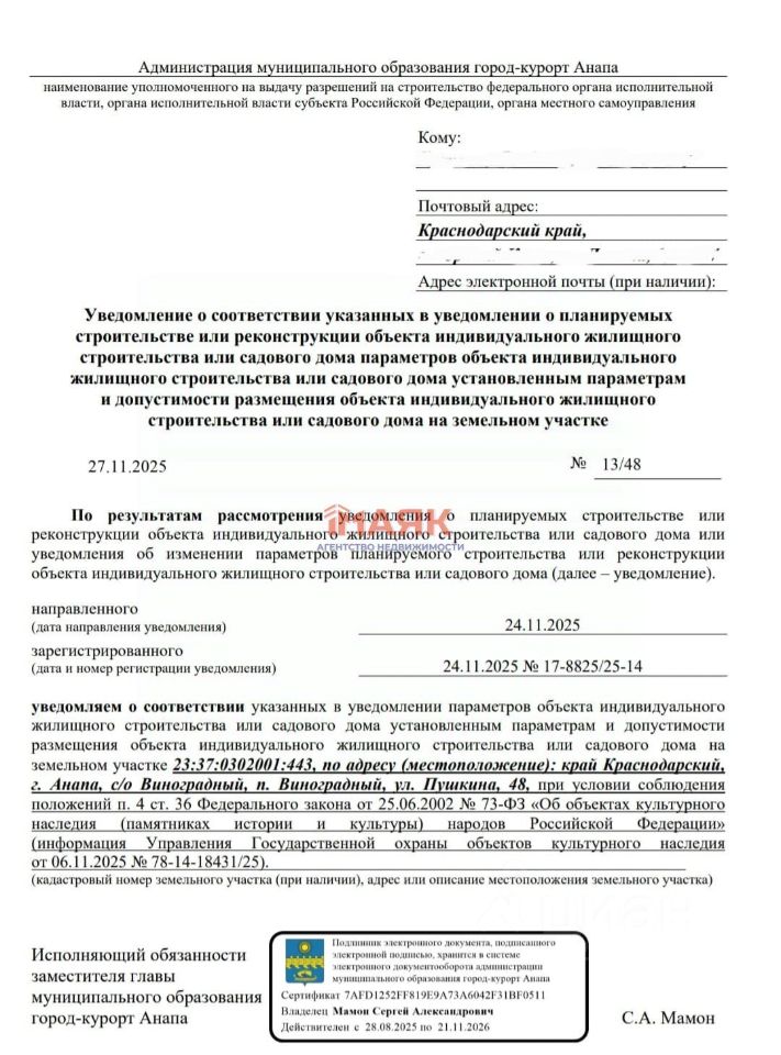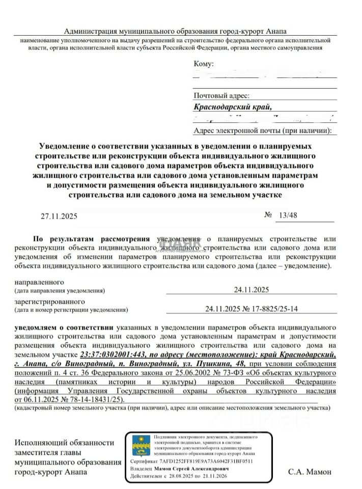 Уведомление на разрешение строительства