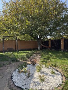 На участке высажены: кусты малины, кусты красной и черной смородины, несколько деревьев вишни, груши, яблони, грецкий орех, шефердия, кусты роз и других кустарников.