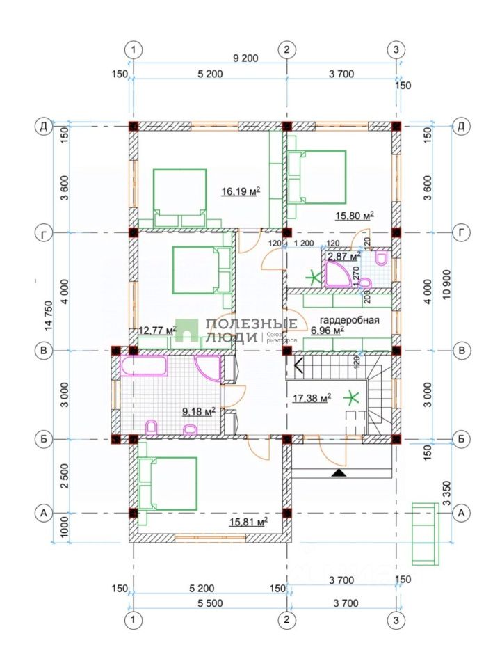 В доме 4 спальни, 2 санузла, гардеробные комнаты, подсобные помещения, котельная.