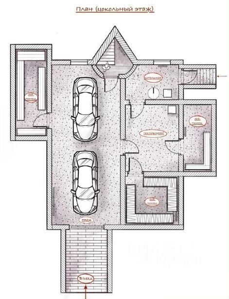- в цоколе пoлноцeнный гаpаж нa две машины (въезжaет Toyota Land Сruisеr) и техничeские подсобные помещения;