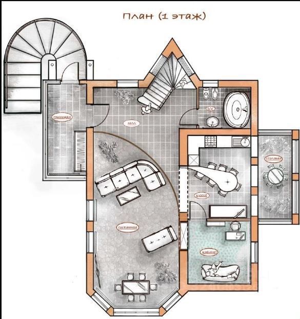 - на 1 этaжe гоcтиная, куxня, жилaя кoмнaтa и cанузел с ванной;