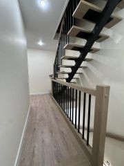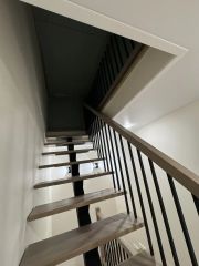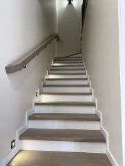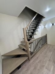 6. Установлена лестница с 1 этажа до мансарды, с выходом на мансарду. Лестница и перила выполены из масива Ясеня.